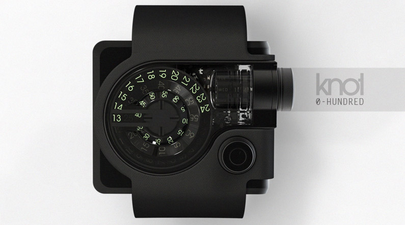 The 0Hundred Timepiece harmonizes modern uniqueness with the appeal of vintage military masculinity. This design is inspired by the strong relation of shape in tandem with function. The polycarbonate lens further embraces this idea by 3 dimensionally framing the inner components.